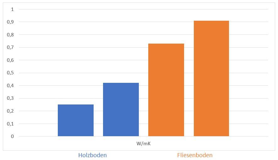 Je höher die Wärmeleitfähigkeit, desto weniger Energie wird benötigt, um die Wärme von A nach B zu transportieren. Das trifft sowohl im Winter auf das Heizen, als auch im Sommer auf das Kühlen zu. Messungen auf der TU in Graz haben ergeben, dass die Wärmeleitzahl λ bei der Fliese bis zu dreimal so hoch ist, als anderen Belägen. Eine sogenannte „Wohlfühltemperatur“ ist demnach bei der Keramik wesentlich schneller erreicht.